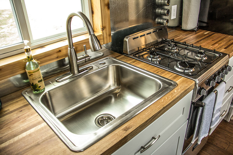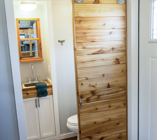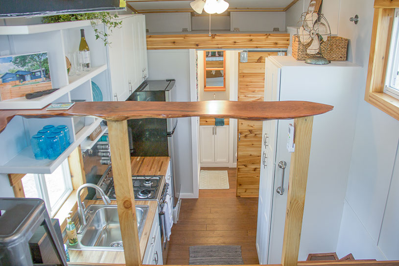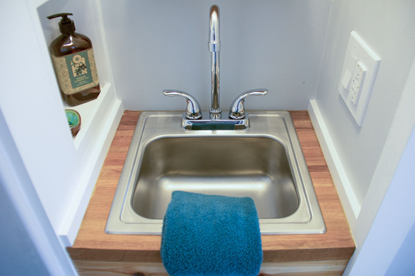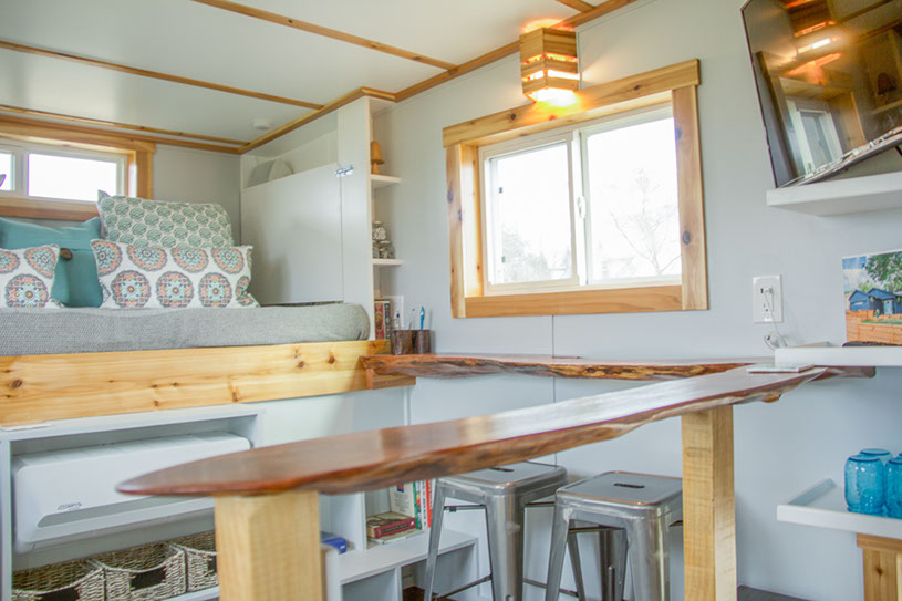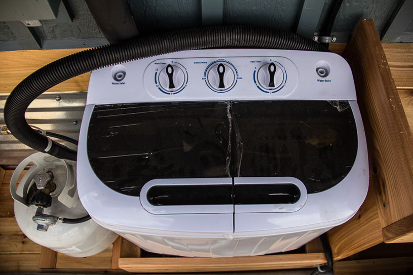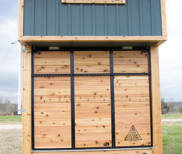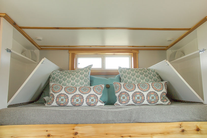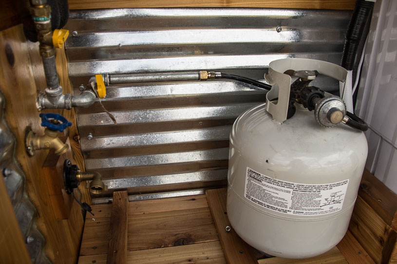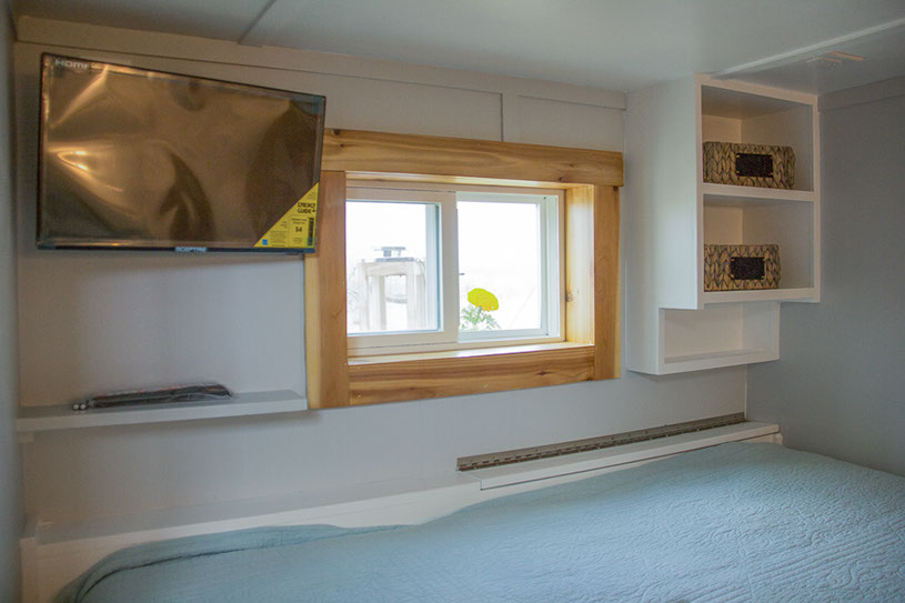 Amenities: full kitchen (30in sink, gas range, refrigerator/freezer, ample cabinet storage) full bath (36in shower, vanity, elongated toilet, linen storage) clothing wardrobe, 40 sq ft lounge with bar and chair. 25 sq ft cantilever with twin size sofa/spare bed, queen size bed bedroom with ample storage for effects/clothing and 19in tv w/DVD, 39 in TV in lounge, washing machine, propane on demand water heater, propane tank, 3000watt generator, grid attach, led lighting, electric mini split air conditioner/heater, black/grey water separation, water collection gutters.