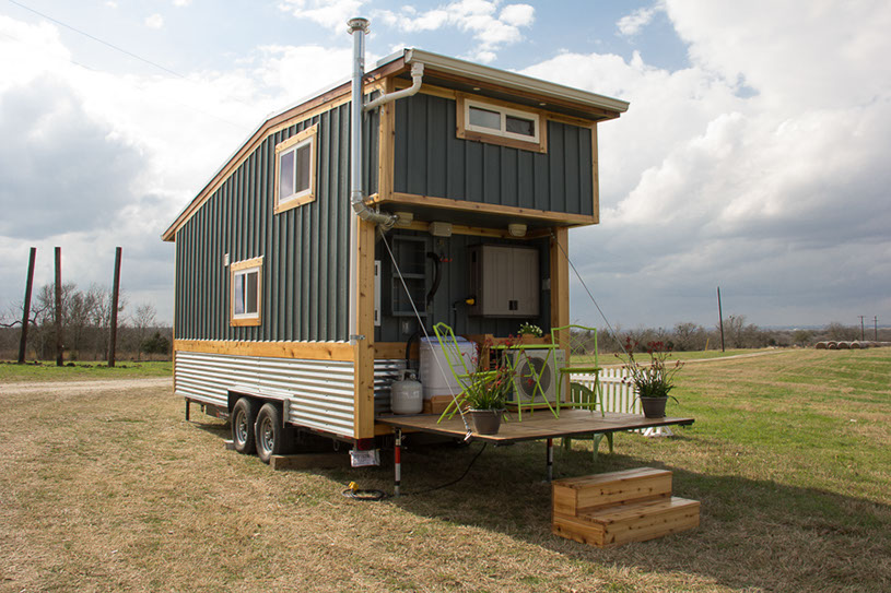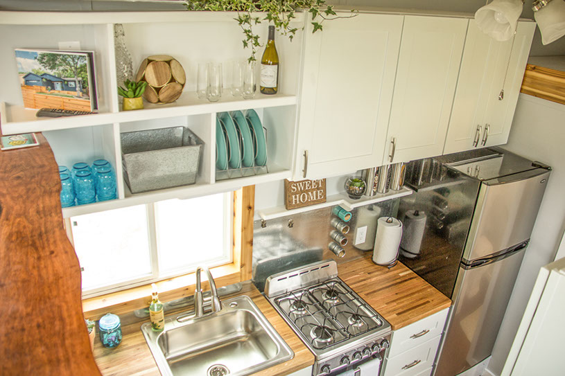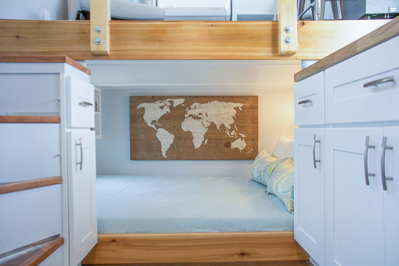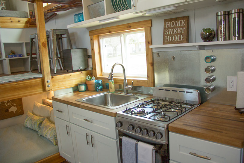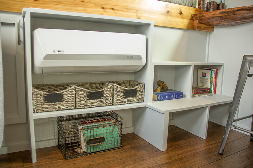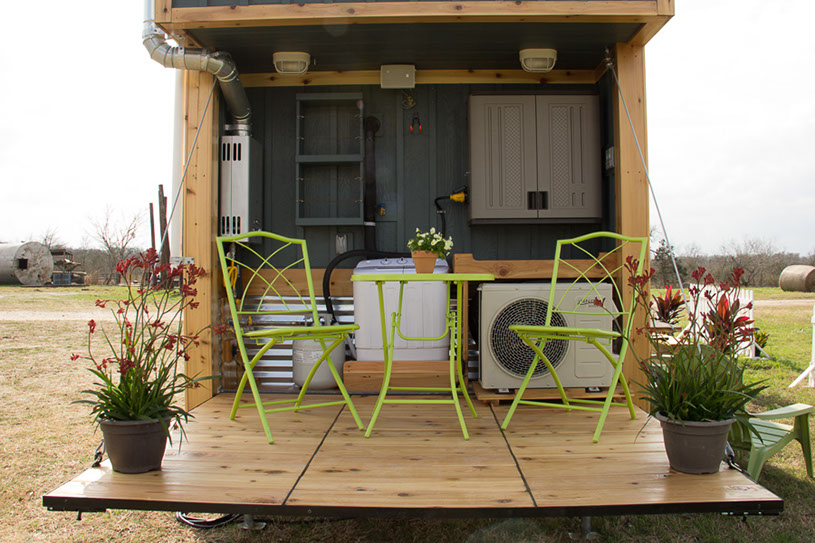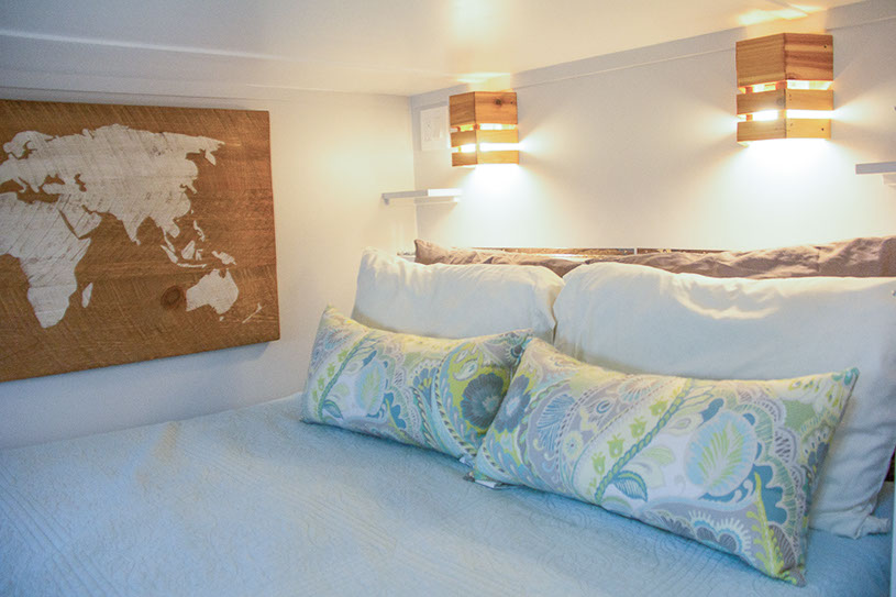 Amenities: full kitchen (30in sink, gas range, refrigerator/freezer, ample cabinet storage) full bath (36in shower, vanity, elongated toilet, linen storage) clothing wardrobe, 40 sq ft lounge with bar and chair. 25 sq ft cantilever with twin size sofa/spare bed, queen size bed bedroom with ample storage for effects/clothing and 19in tv w/DVD, 39 in TV in lounge, washing machine, propane on demand water heater, propane tank, 3000watt generator, grid attach, led lighting, electric mini split air conditioner/heater, black/grey water separation, water collection gutters.