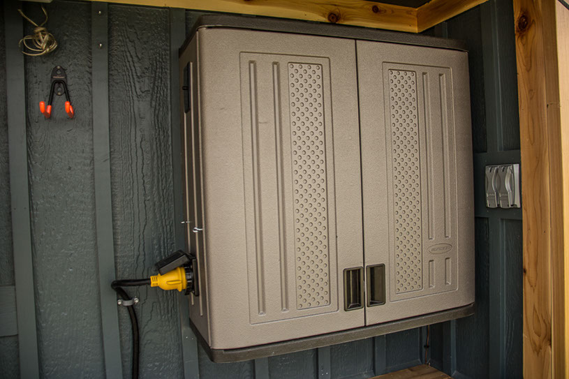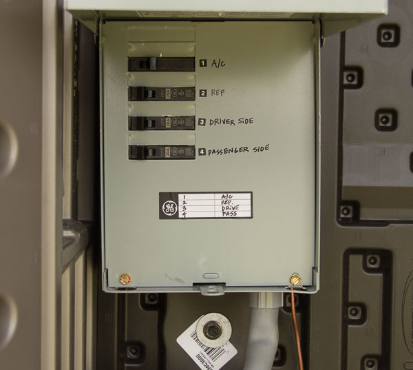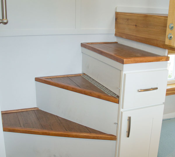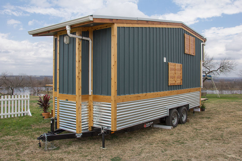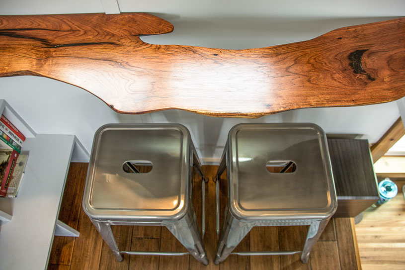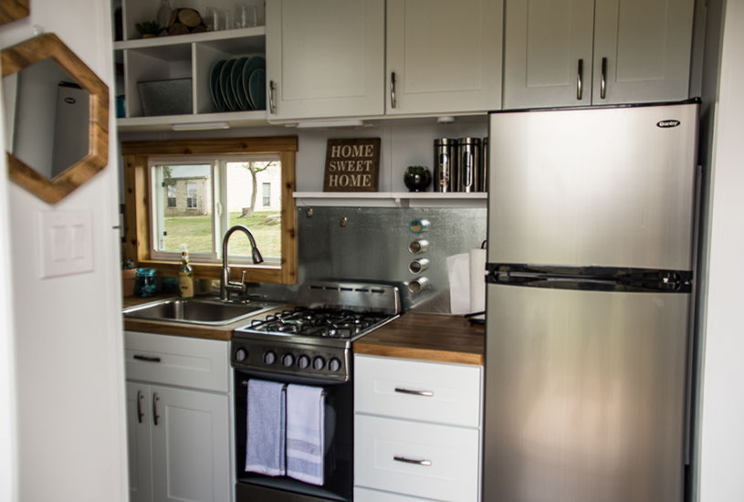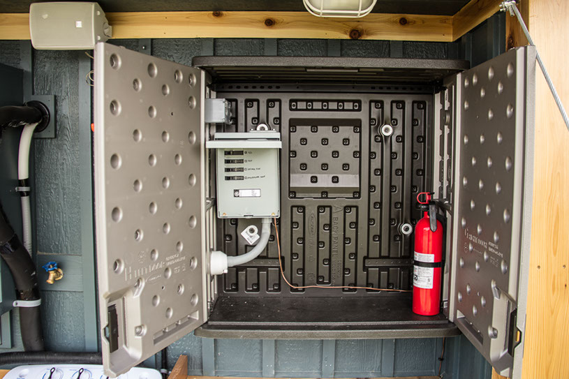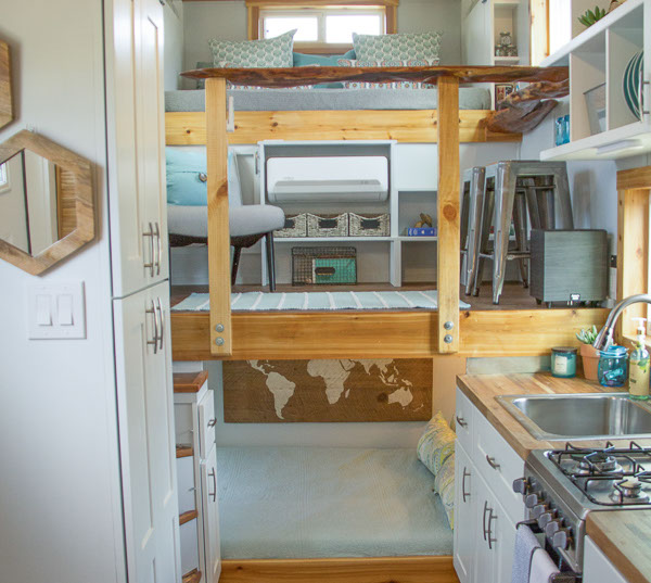 Amenities: full kitchen (30in sink, gas range, refrigerator/freezer, ample cabinet storage) full bath (36in shower, vanity, elongated toilet, linen storage) clothing wardrobe, 40 sq ft lounge with bar and chair. 25 sq ft cantilever with twin size sofa/spare bed, queen size bed bedroom with ample storage for effects/clothing and 19in tv w/DVD, 39 in TV in lounge, washing machine, propane on demand water heater, propane tank, 3000watt generator, grid attach, led lighting, electric mini split air conditioner/heater, black/grey water separation, water collection gutters.